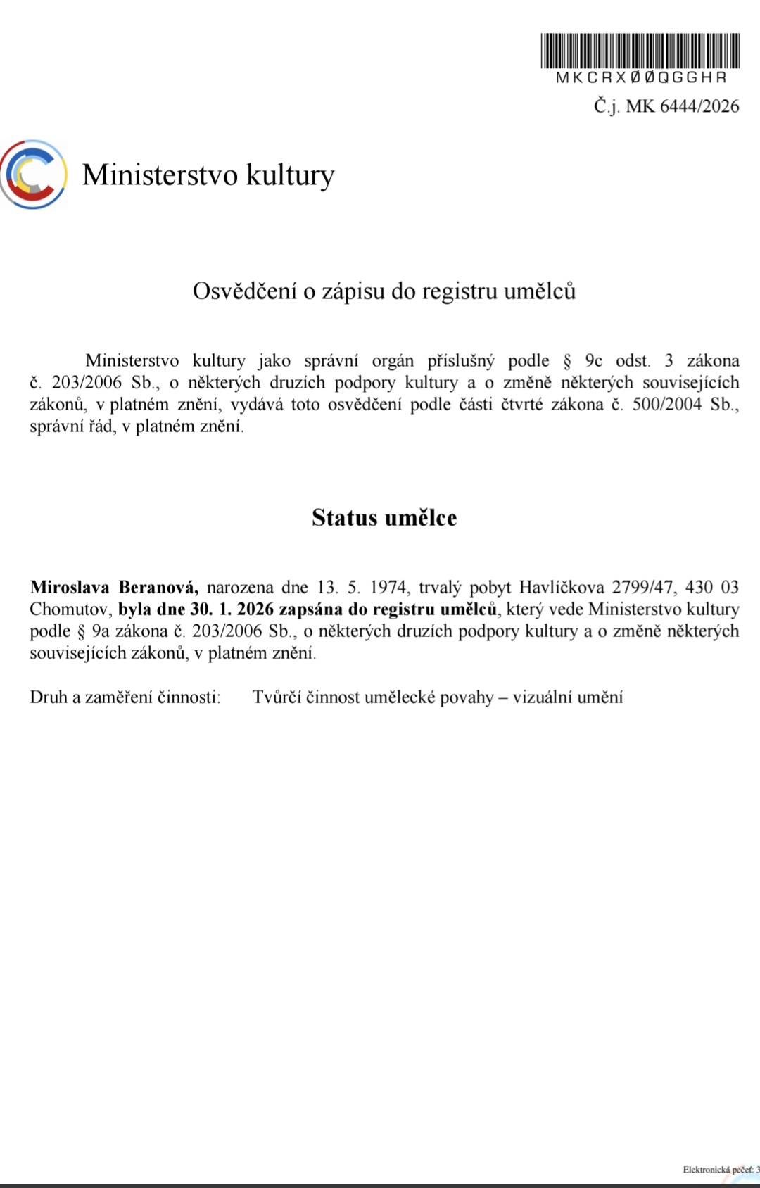 Mirka Beranová, narozená 13. 5. 1974 v Chomutově, je malířka, ilustrátorka a učitelka výtvarné výchovy. Její obrazy jsou oknem do světa plného světla, jemných detailů a hlubokého citu pro barvy. Svou tvorbou i pedagogickou prací propojuje krásu, klid a vnitřní rovnováhu. Kromě malby se věnuje ilustracím, keramice a výtvarným kurzům pro děti i dospělé.